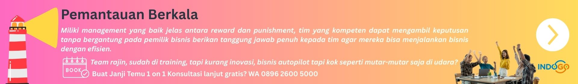 Hanya 2 menit dapatkan instant tools sistem program demo gratis sesuai kebutuhan bisnis anda, INDOGO solusi lengkap untuk bisnis Anda; SOP, sistem, dan people siap dampingi bisnis Anda capai Autopilot, jadikan bisnis anda hemat waktu, energi, emosi dan uang, Mari Konsultasi Cerdas sekarang di Indogo, cepat, tepat, terjangkau.